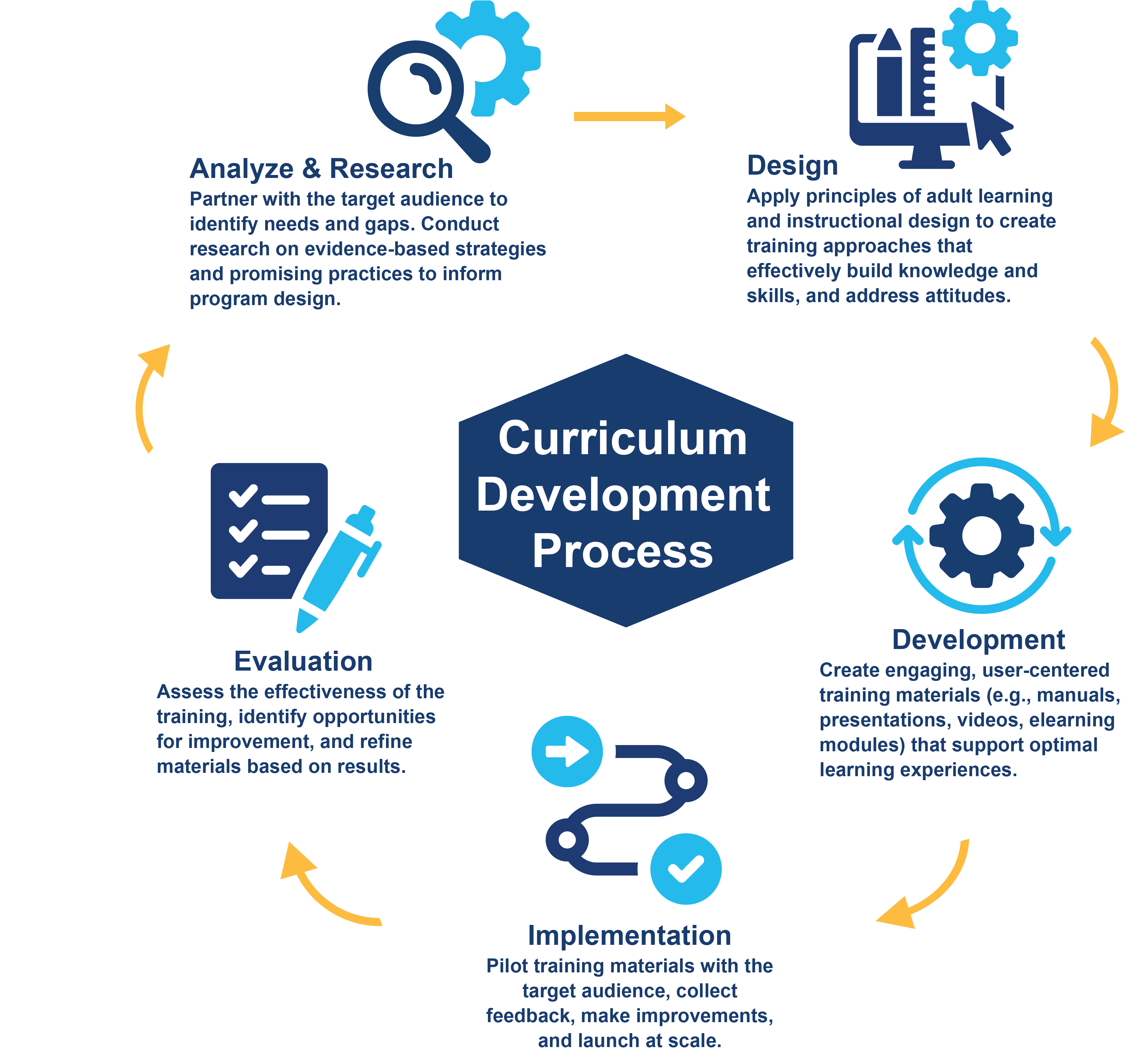 CAI designs tailored curricula to help organizations increase their staff’s knowledge and skills, so that they can deliver high-quality services. We develop instructional manuals, training materials, and in-person and web-based learning programs that translate research into practice with user-friendly approaches. We pilot test all curricula to continue improving them.